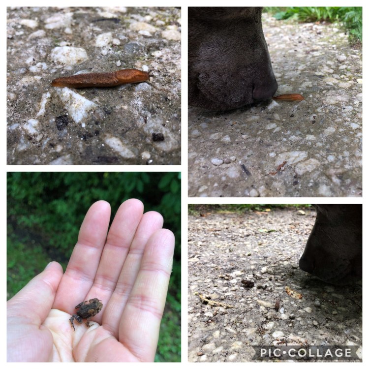 These little creatures are also on the move, amusing Mag endlessly. The orange slug is the only one we come across from the gastropod family but plenty of tiny frogs crossing the path coming from the river. We save as many as we can mostly from bikers.