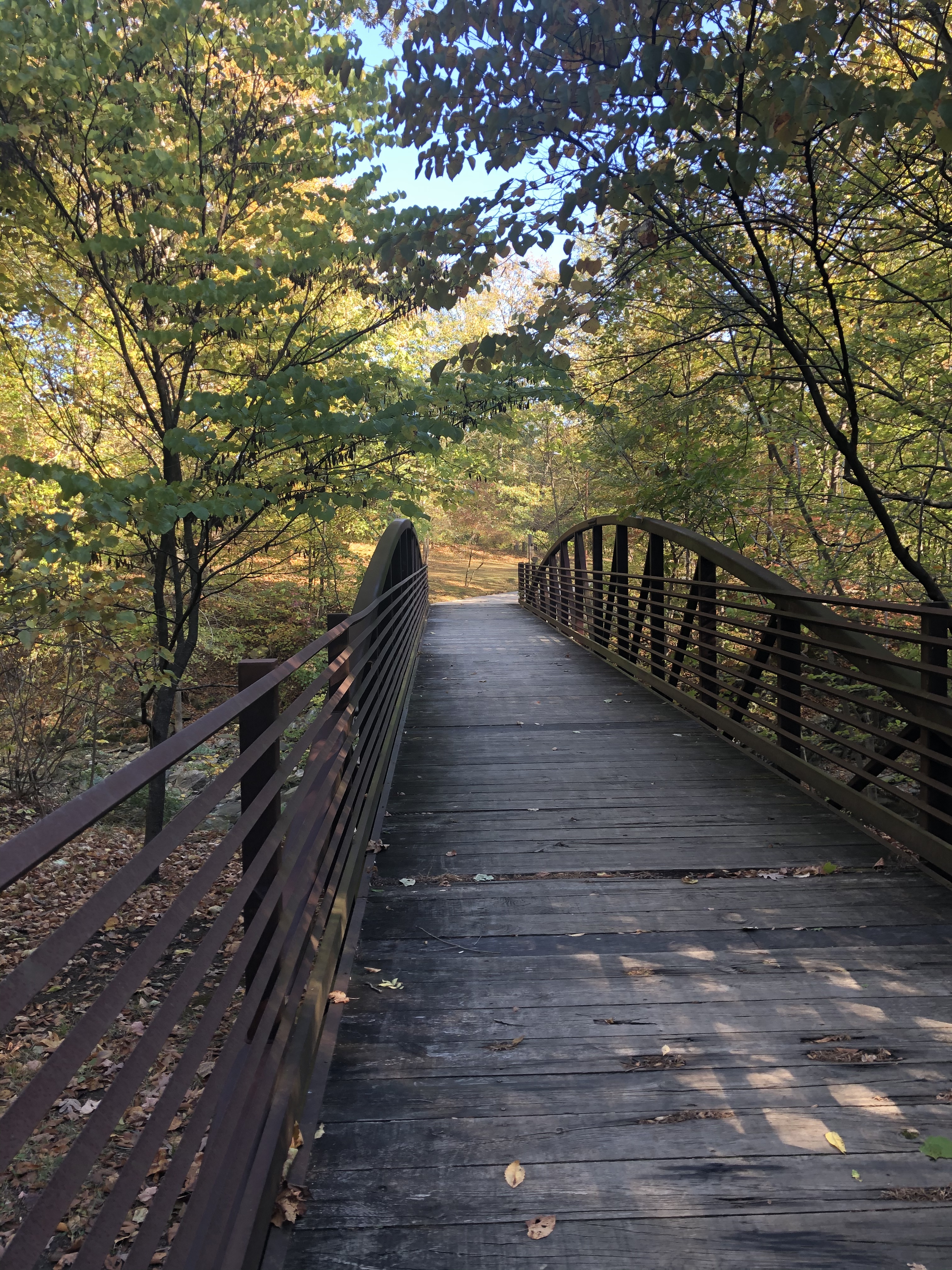 There are two options of trails to take when we reach yet again another bridge. To the left is Stream trail which will end up where the right trail is going but faster. Stream trail also has a fork in the woods which can be followed to end up at the junction of Wetheredsville and Hutton roads. However we will take the right path onto the bridge and then turn left to also end up just there but walking on paved surface instead of trail material.
