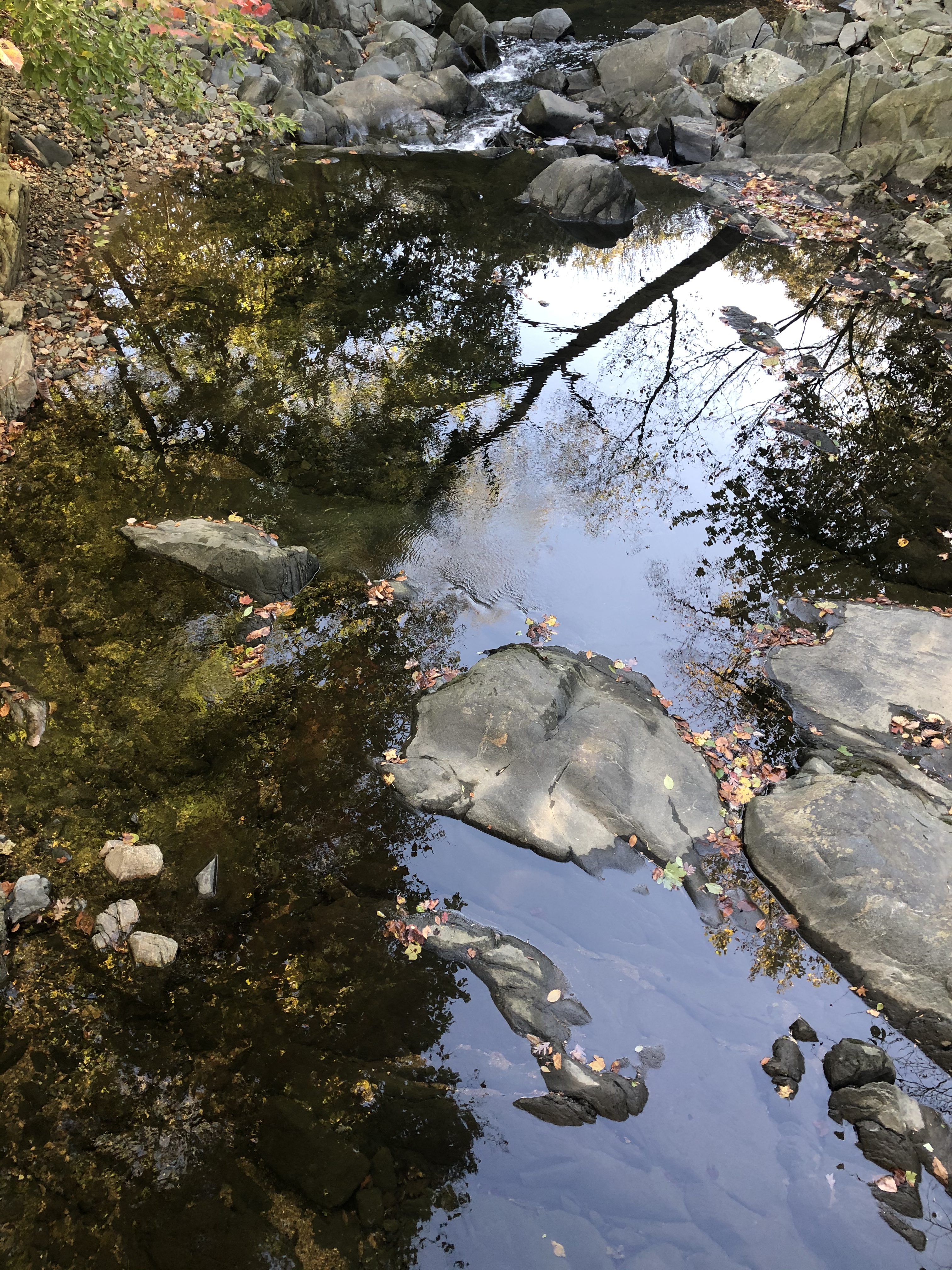 Cutting through the woods towards the bike trail, we are entertained by falling leaves and chattering chickadees. There is another sound….Franklintown rd. It’s below us on the right and it provides us with a different rhythm. Morning traffic. It’s a cut through to the city for most people living in the area.