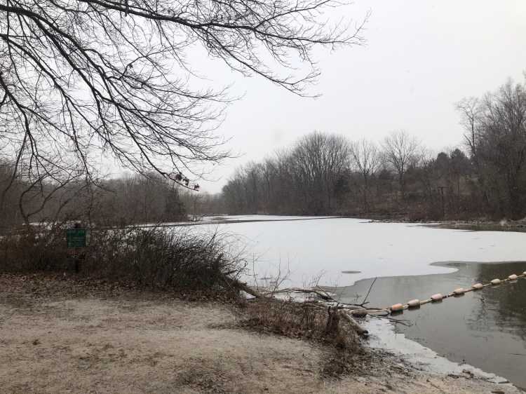 After arriving at 11:25 am and getting ready for our stroll – it’s 30F so wearing 5 layers is a must for me – it starts snowing. Mag has to smell all the evergreen trees next to the tennis courts, then we are ready to follow the sign towards Lake loop.