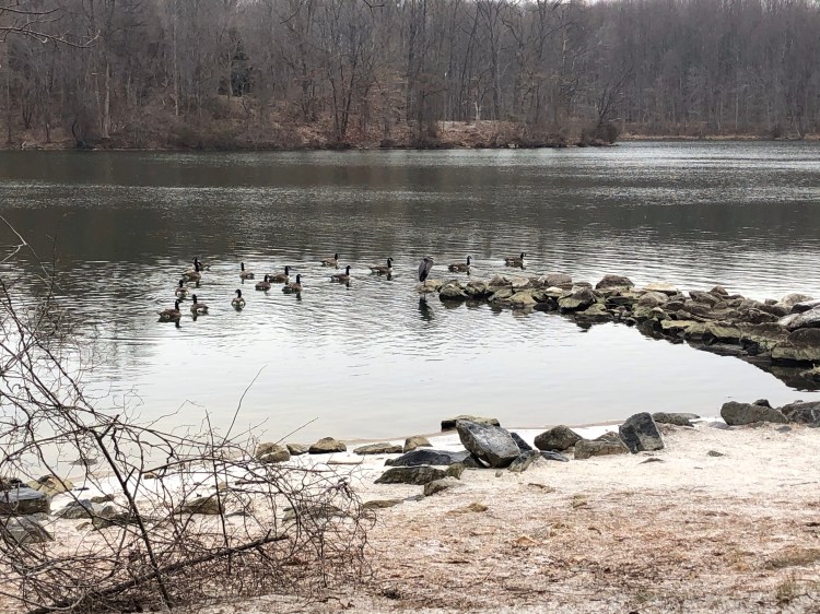 After rounding the corner beyond the boathouse we arrive to Centennial South. Just before the boat dock there is a wonderful little beach, where now a small flock of Canadian Geese floats around a Great Blue Heron. He is sitting on a rock trying to conserve as much heat as he possible can.