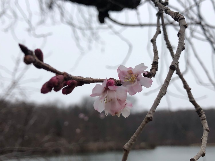 While waiting for Mag to finish his rolling session I noticed some pink on trees framing the path. Getting closer I didn’t want to believe my eyes! Cherry blossoms.