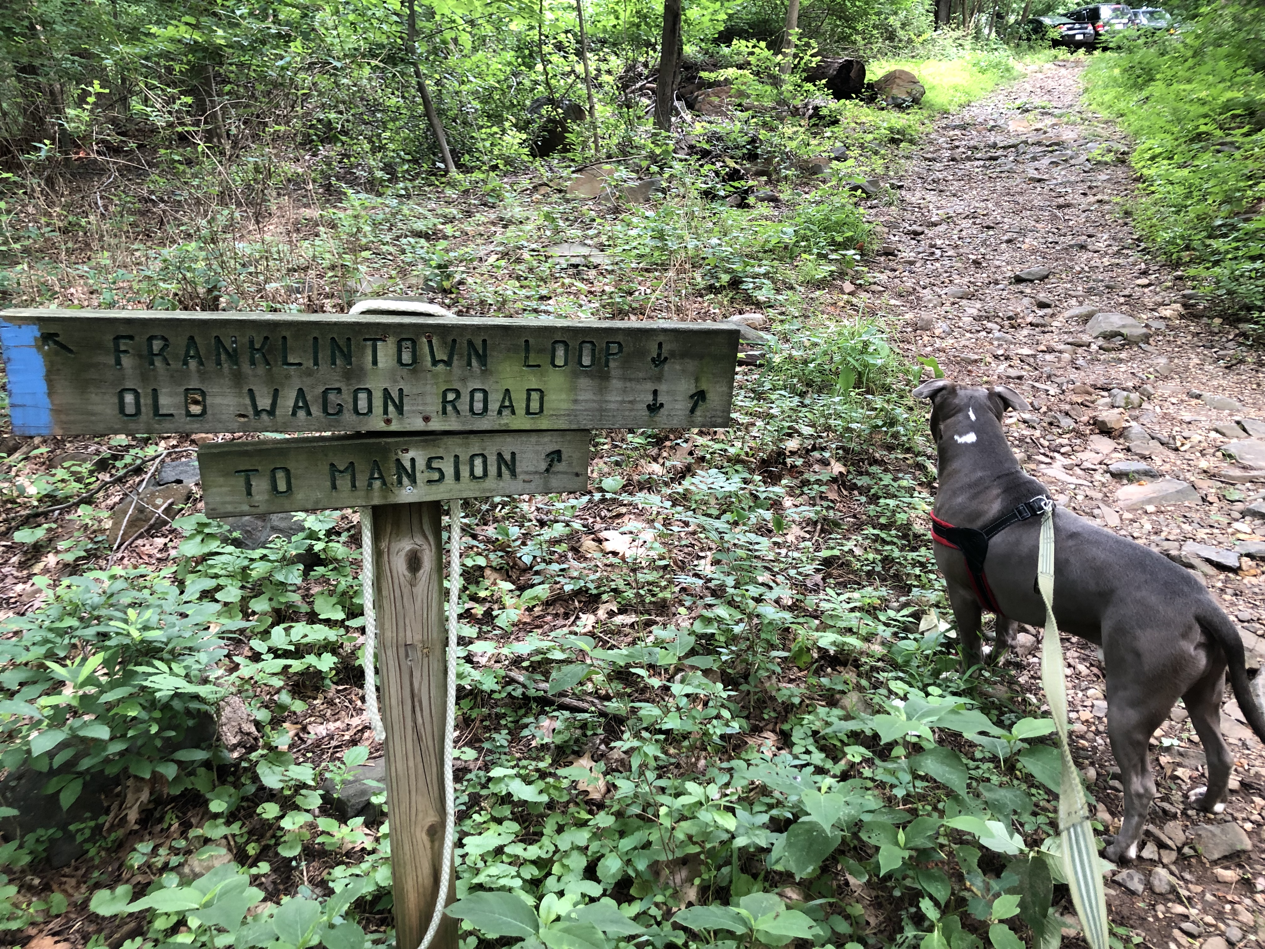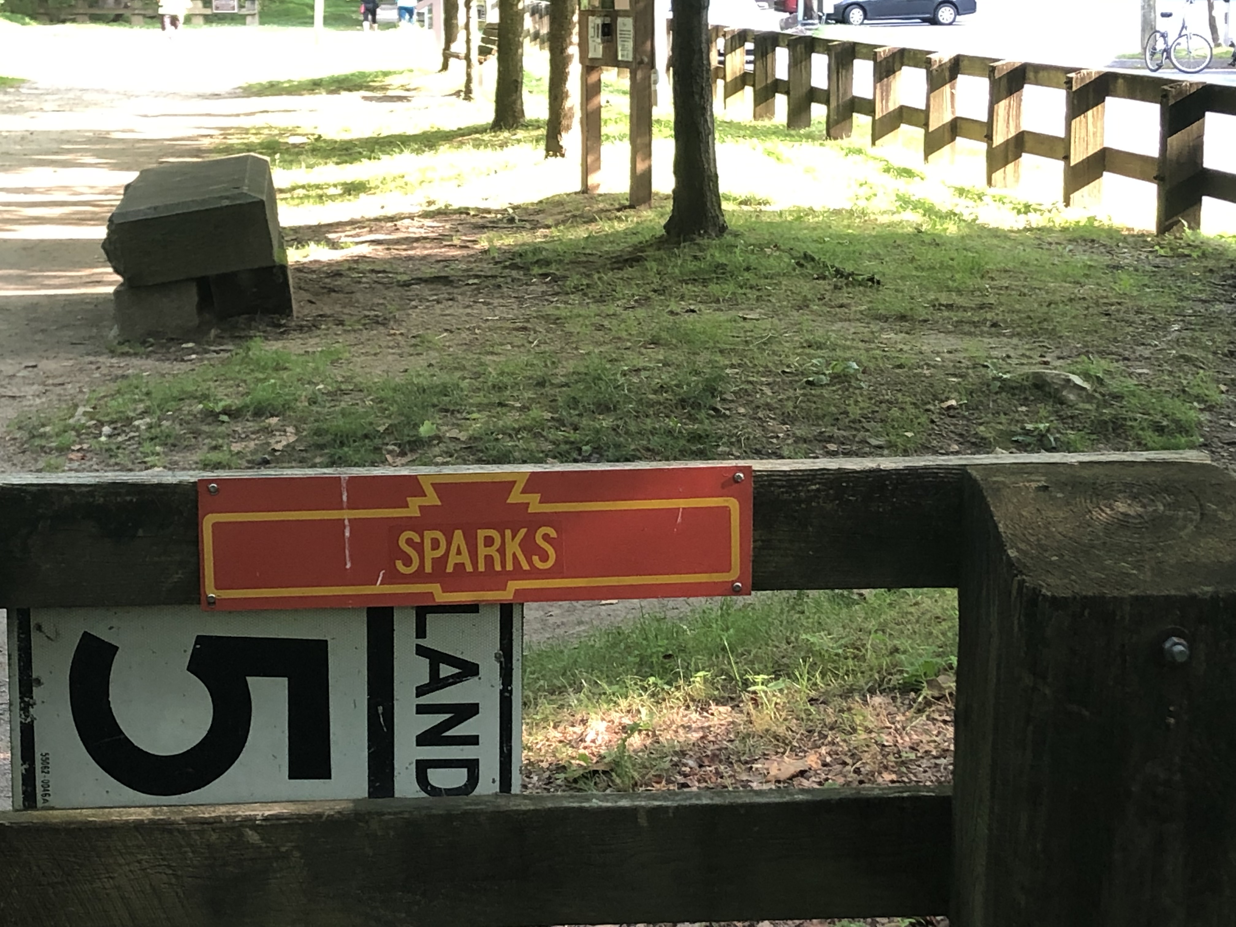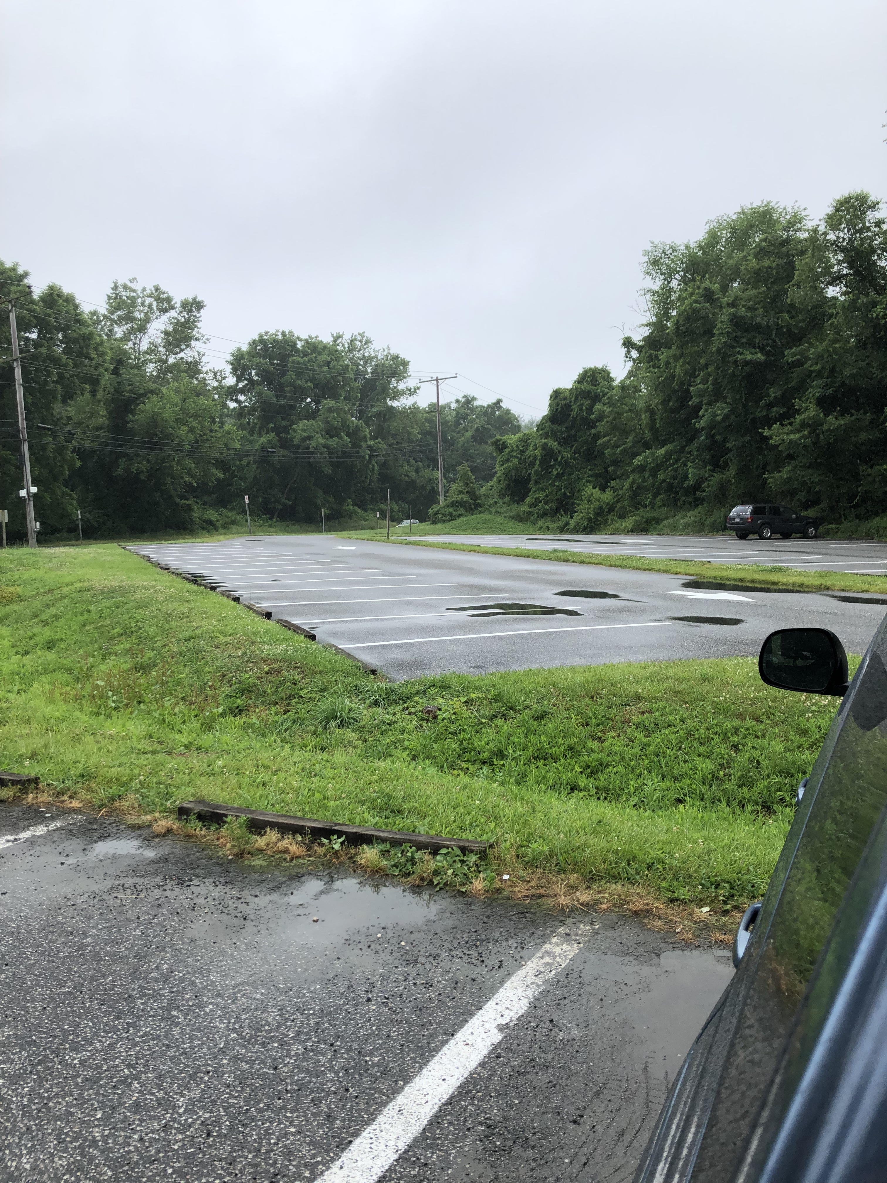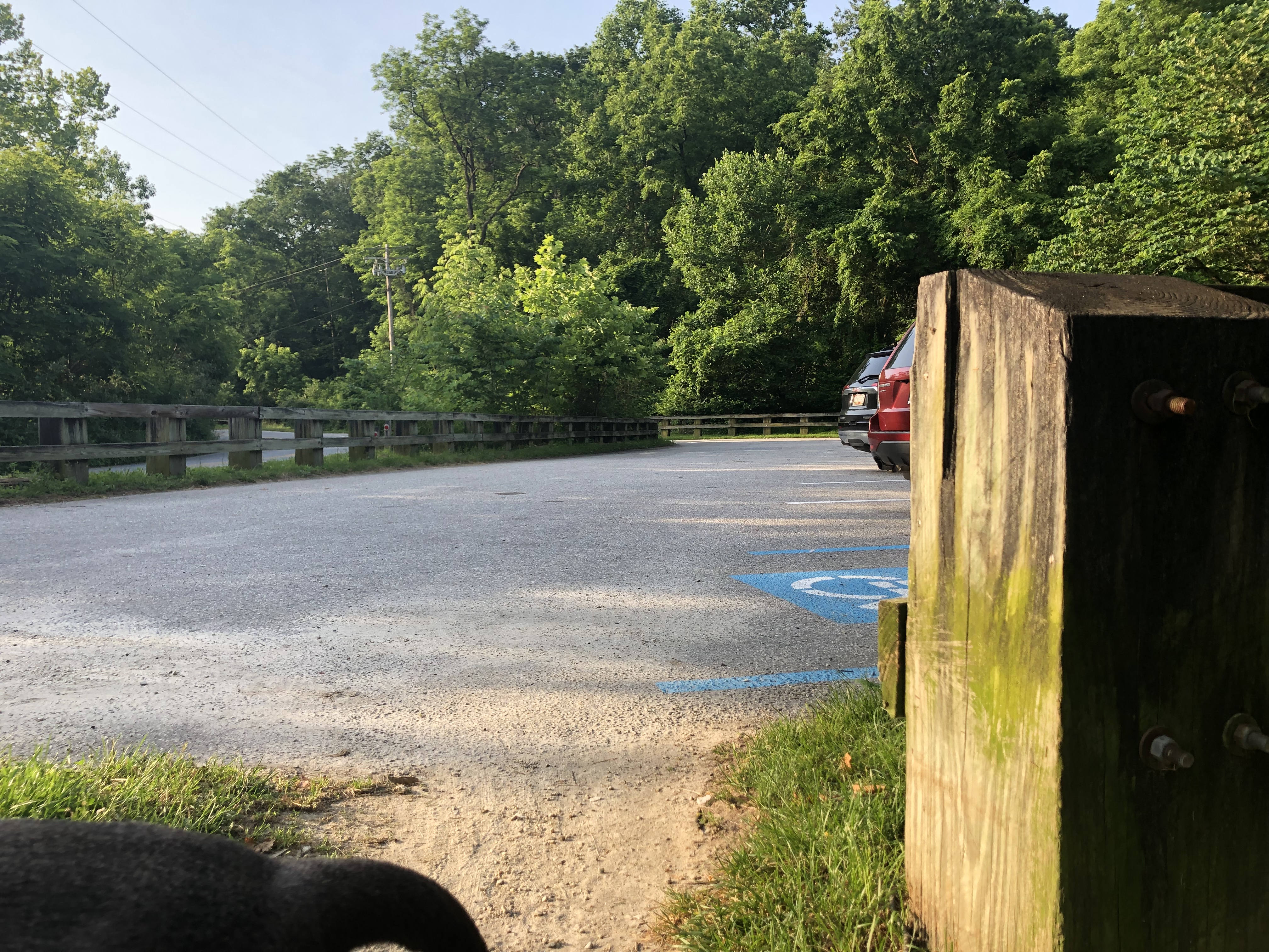 Up the small hill, through the parking area, keeping left, down the brand new stairs to our car.
